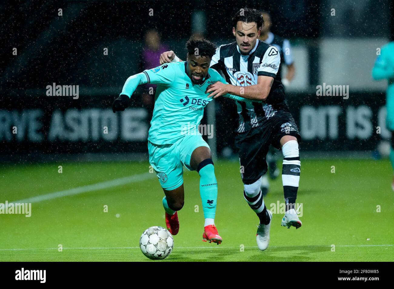 Almelo Niederlande 10 April Che Nunnely Von Willem Ii Und Giacomo Quagliata Von Heracles Almelo Kampfen Wahrend Des Eredivisie Spiels Um Den Besitz Stockfotografie Alamy